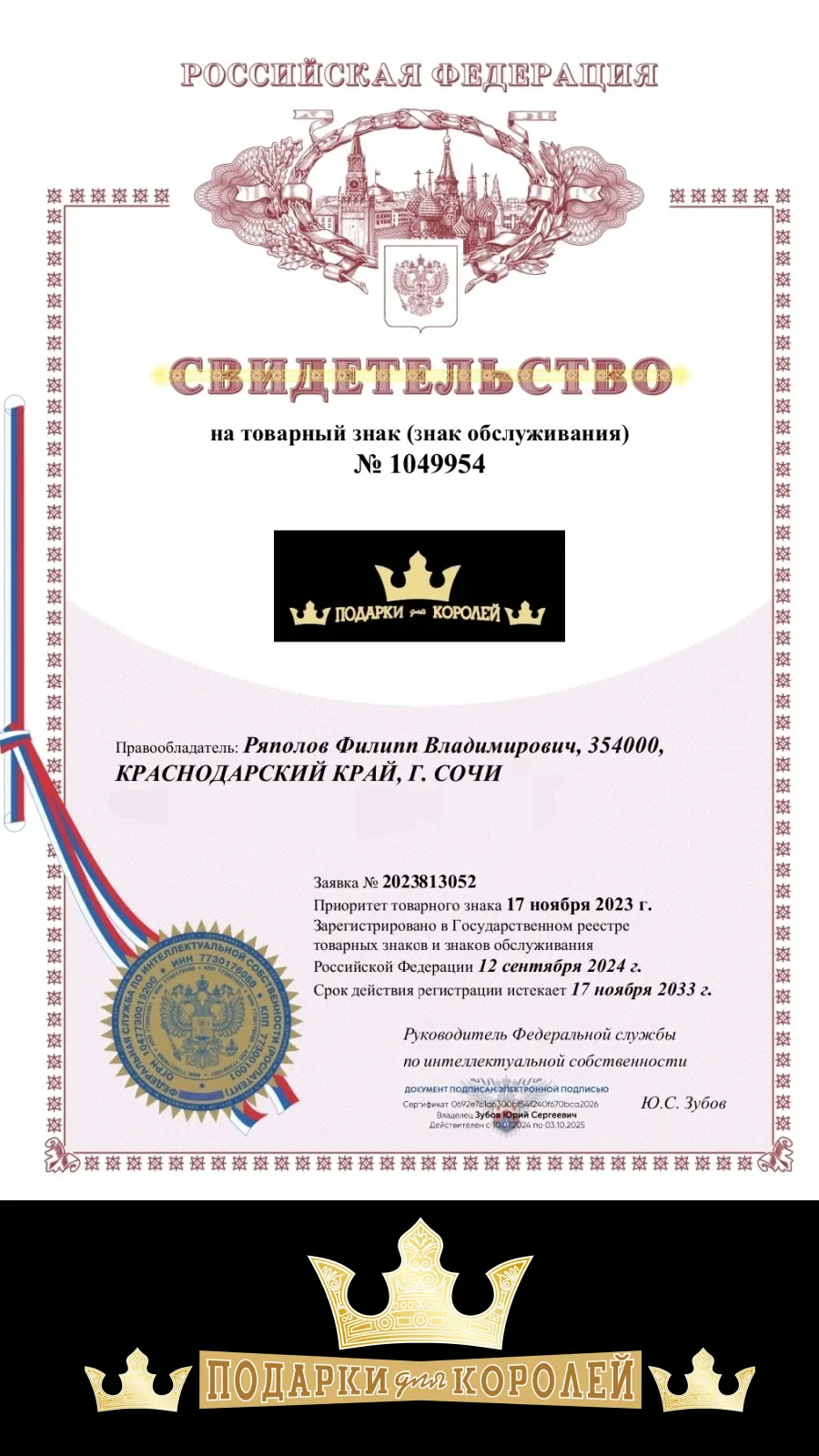 Наличие зарегистрированного товарного знака гарантирует подлинность бренда «Подарки для Королей» и подтверждает законность его использования в коммерческой деятельности.